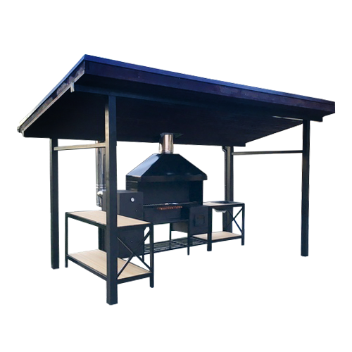 черныйМангал-кухня Пища, приготовленная на природе, обладает особым вкусом и ароматом. Идеальным местом для такого приготовления может стать наша модель мангала-кухни, которая обеспечит максимальный комфорт и эстетическое удовольствие. Эта эксклюзивная модель отвечает всем требованиям, которые предъявляются к таким изделиям: долговечность – за счет применения металла и покрытия высокого качества, многофункциональность – за счет наличия классического мангала и печи, комфорт – за счет эргономического размещения рабочих и вспомогательных зон, универсальность – за счет внешнего вида, вписывающегося в любой экстерьер. Короб мангала изготовлен из высококачественной листовой стали (стенки – 3 мм по умолчанию). Оптимальный размер позволяет приготовить достаточное количество шашлыка для семьи или компании. Наличие печи позволит расширить перечень блюд. Благодаря съемным кольцам на варочной поверхности можно использовать посуду разного размера и вида. Модель оснащена рабочими столами и большими дровницами. Параллельная плани