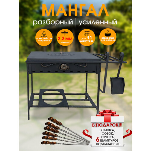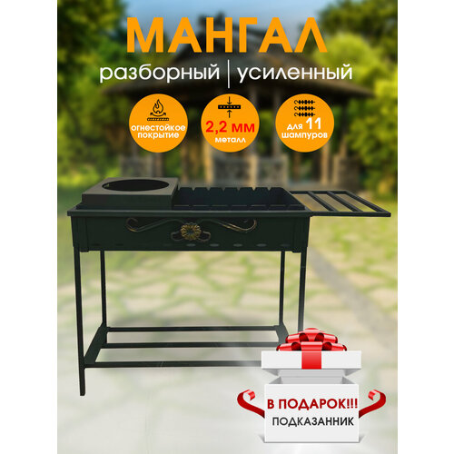 черныйМангал усиленный 2.2мм с подказанником, совком и кочергой. . Складной, многоразовый. Отлично подойдет для дома, дачи, пикника. Выполнен из стали 2,2мм. Высота чаши способствует быстрому прогреву. Имеет боковую полку под посуду. Выполнен с использованием лазерной резки металла-точность в обработке + украшен элементами под ковку. Стыки мангала сварены внахлест, обработан огнестойкой краской-более долгий срок эксплуатации. Использовать как Мангал для шашлыка. Можно готовить на углях и на дровах. В комплект входит: чаша мангала, 2 ножки, нижняя перемычка под дрова, боковая подставка под посуду, подказанник, совок, кочерга. Так же, кочергу с совком можете приобрести отдельно.