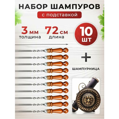 Шампура для мангала с деревянной ручкой (комплектация: 10 шт.) + Шампурница "Пушка" цвет: золото, длина: 62 см. длина: 72 см.