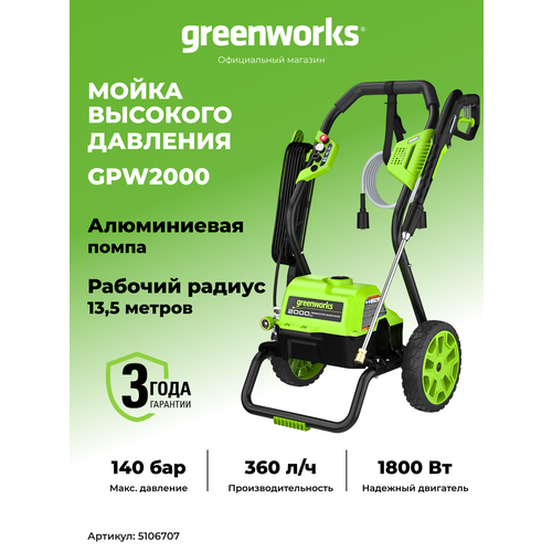 Мойка высокого давления электрическая Greenworks Арт. 5106707, 2000 Вт, 140 бар