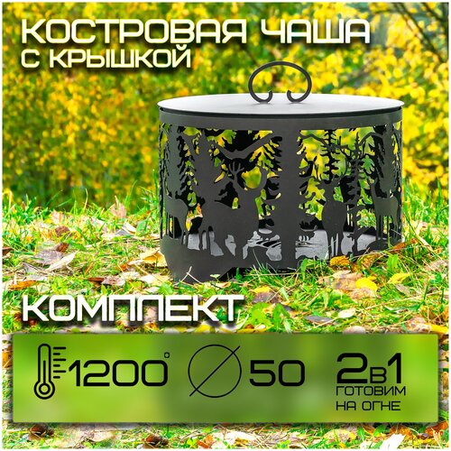 Костровая чаша Олени на трубчатых ножках с защитной сеткой диаметр 50 см/Чаша для костра в подарок на дачу