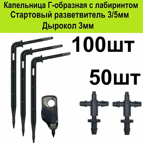 Капельница стрелка Г-образная 10см. (100шт) + стартовый разветвитель под трубку 3/5мм для капельного полива растений в теплице самотеком от бочки