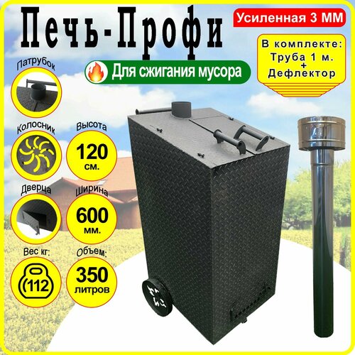 Печь для сжигания мусора Квадратная Усиленная 3 мм. Профи - Большая с колосником, трубой и дефлектором.
