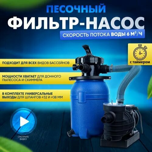 Подходит для механической чистки воды в бассейнах объемом до 32 куб. м (32 000 литров). Система очистки обслужит детский надувной, большой каркасный, глубокий сборный бассейн, Intex 28698 (Интекс) и Bestway 58515 Flowclear (Бествей). Объем засыпки кварцевого песка составляет 10 кг фракции 0,4-0,8 мм (не включен в комплект и покупается отдельно). Также в качестве фильтрующего наполнителя можно использовать стеклянный песок фракции 0,5-1 мм, или синтепоновые шарики Polysphere. Песчаный фильтр не имеет таймера, но есть 6-ти позиционный клапан, как на профессиональных моделях; манометр, показывающий степень загрязнения; сливная пробка для удобной консервации; центратор; тихий и надежный водяной насос, работающий от сети 220 В, с мокрым ротором. В комплектацию входят металлические хомуты, адаптеры-переходники для шлангов 32 мм и 38 мм. Инструкция по сборке и экс
