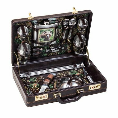 В комплекте: 4 вилки из нержавеющей стали, 4 ложки из нержавеющей стали, 4 стакана из нержавеющей стали, штопор-сомелье, нож туристический складной из нержавеющей стали, 4 блюда для закусок из стали с никель-серебряным покрытием, чехол для кейса из высокопрочного прозрачного пластика предназначенный для защиты от влаги и сохранения товарного вида.