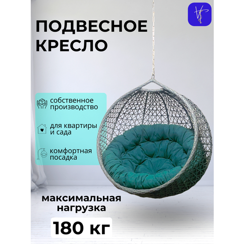 Подвесное кресло садовое, снежка без стойки, серая, бирюзовая подушка