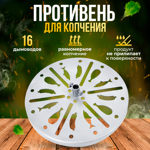 Поддон для продуктов выполнены из пищевой нержавеющей стали. На поверхности противня нанесен логотип, 18 продолговатых отверстий-дымоводов, 12 дополнительных ближе к краю и 6 - ближе к центру. Они обеспечивают равномерное перемещение дыма в коптильне. На одном таком поддоне можно разложить до 5 кг продуктов.