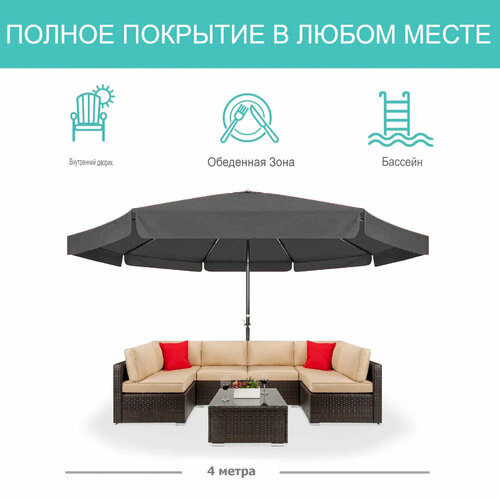 Особенностью данного садового зонта является его размер. Диаметр купола составляет 400 см, что позволяет обеспечить отличную защиту от солнечных лучей.