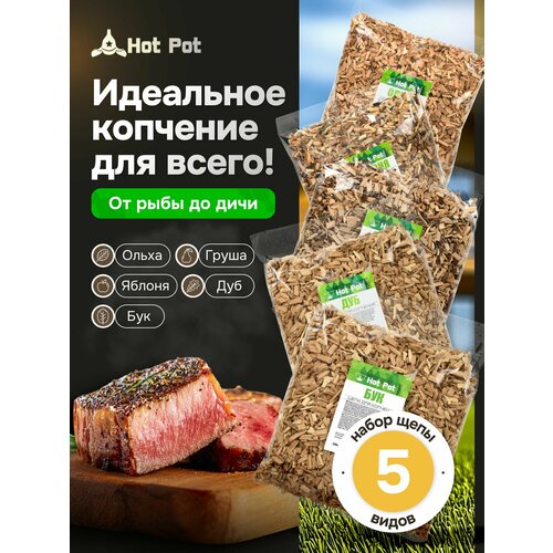 Набор щепы для копчения 5 шт, Ольха, Дуб, Бук, Яблоня, Груша / HOT POT / для холодного копчения, средняя фракция