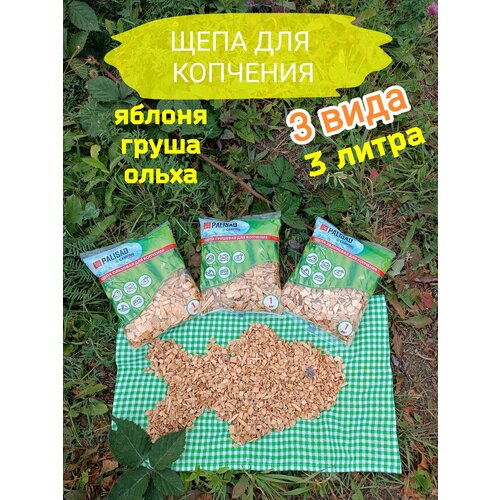 Щепа для копчения Набор Ольха-3шт Яблоня Вишня Бук, фракция 8-12 мм для домашнего копчения мяса, птицы, рыбы, сыра