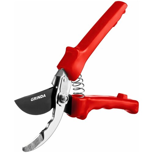 Компактный плоскостной секатор Grinda PRO Line 423417 с цельнокованой конструкцией для повышенной износостойкости.