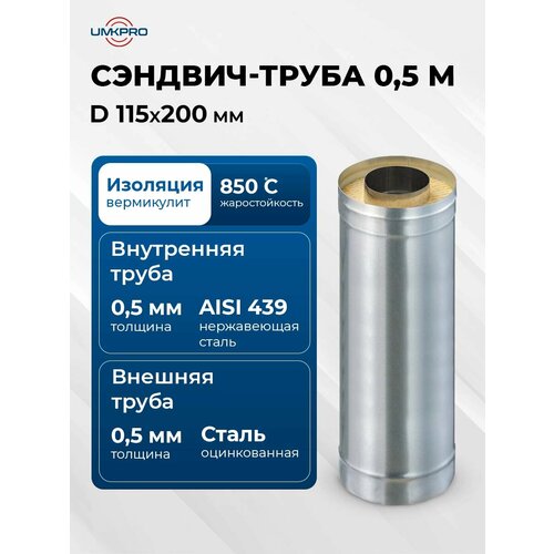Сэндвич-труба для дымохода 0,5м UMKPRO, D 115х200, AISI 439/Оц, 1,0мм/0,5мм