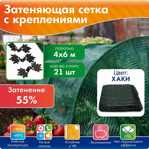 Сетка затеняющая для теплиц, для забора, маскировочная сетка для беседки, 55г-кв. м (4 х 6 м) + 21 клипс