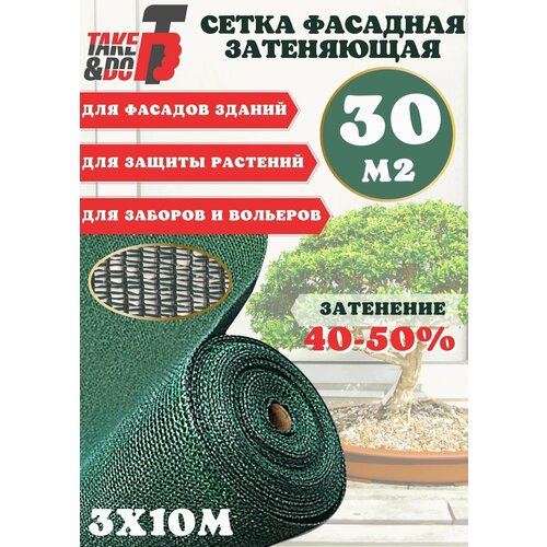 Сетка затеняющая фасадная от солнца для огорода, теплиц, для навеса, для забора 3,0х10м зеленая, плотность 55г/м2 TAKE&DO
