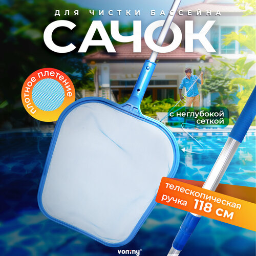 Сачок для бассейна с телескопической ручкой, не глубокий, со складной 5 секционной ручкой для чистки (уборки) листьев, насекомых, пуха с поверхности воды чана, купели. Vommy Classic