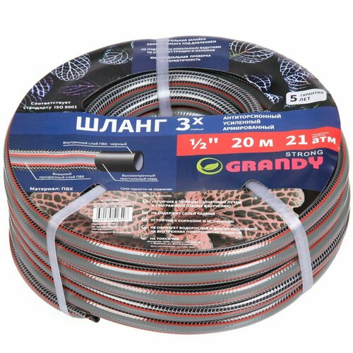 Шланг поливочный, 1/2 ', 21 атм, армированный, 20 м, 3 слоя, Grandy, Strong, ПВХ, PGH-12E-20