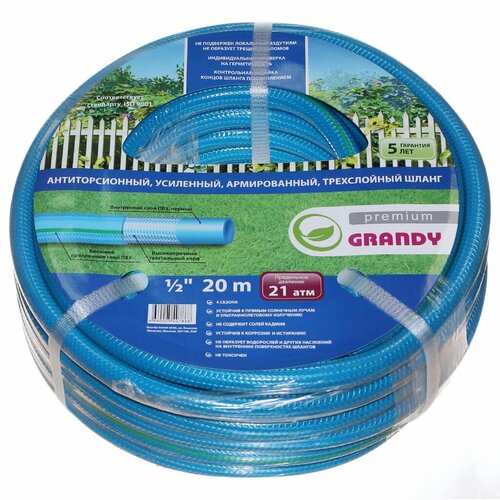 Шланг поливочный, 1/2 ', диаметр 15 мм, 21 атм, армированный, 20 м, 3 слоя, Grandy, Premium, ПВХ, усиленный
