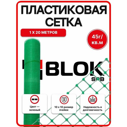 Сетка пластиковая 1х20м 10х10мм зеленая 45гр/м2 садовая, для сада, цветов, растений, забора 4620214450871