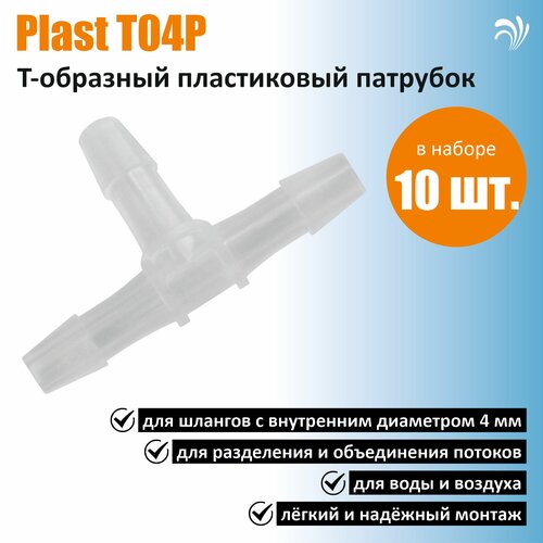 Krelong Plast T04P - тройник, T-образный пластиковый патрубок для соединения шлангов с внутренним диаметром 4мм, набор 10 штук