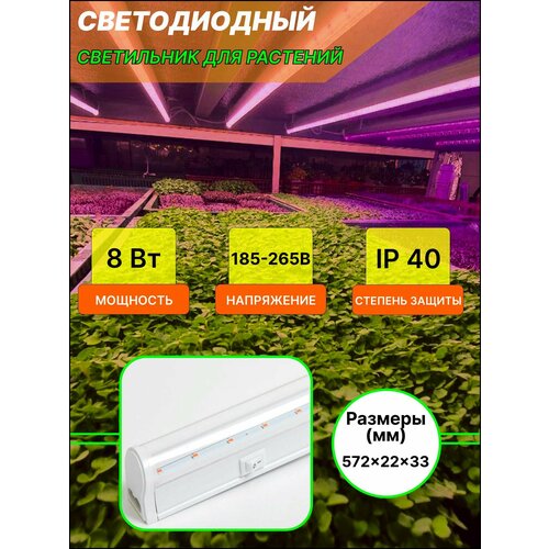 General, Фитосветильник, Мощность 8 Вт, Длина 600 мм, Свет Розовый, спектр для рассады , Питание 220В, Степень пылевлагозащиты IP40