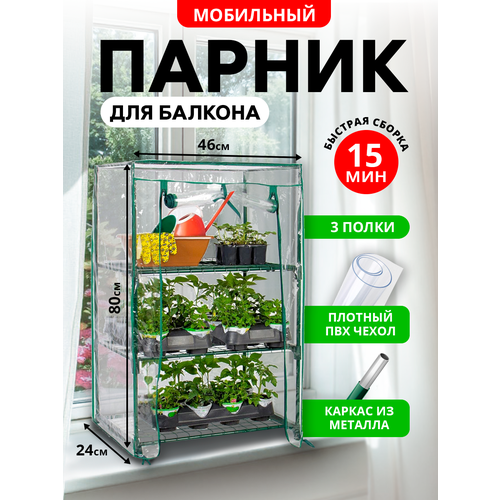 Парник для рассады на подоконник/стеллаж напольный (мет тр в пвх d-10мм+чех: пл пвх) 24х46х80 см разборный 3 полки 'Урожайная сотка'