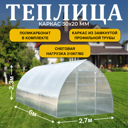 Теплица ТМК Стелла. Каркас из профильной трубы 30х20 мм, прозрачный поликарбонат 3,7 мм, 6х2,7х2,3 м
