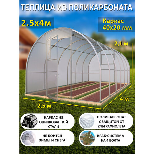 Теплица Арочная из поликарбоната 2,5 х 4 метра, оцинкованный каркас 40х20 мм - Боярская Люкс