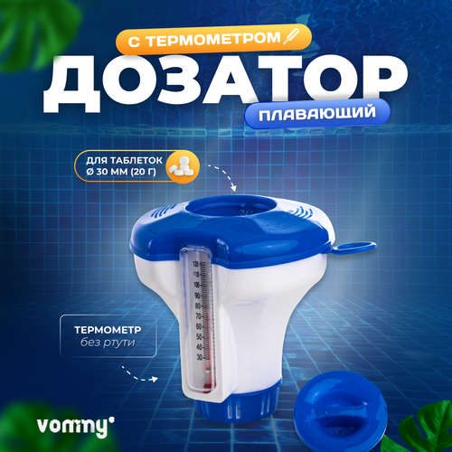 Дозатор с термометром плавающий (поплавок) средний для растворения химии в бассейне Vommy (размер таблеток: 30 мм, 20 г) синий