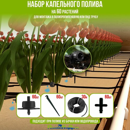 Набор капельного полива на 60 растений. Для монтажа в полипропиленовую или ПНД трубу. Для теплицы, грядок, сада, питомников.