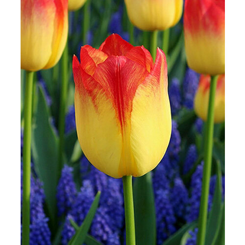 Хеппи Дженерейшн» имеет крупные и яркие цветы, которые характеризуются жёлтой окраской с красными или оранжевыми полосами или пятнами. Это создает эффектный контраст и делает цветок очень привлекательным. 2. **Высота**: - Растение достигает высоты от 30 до 40 см, что делает его подходящим для использования как в цветниках, так и в срезке. 3. **Условия роста**: - Тюльпан предпочитает солнечные или слегка затенённые места. Он предпочитает хорошо дренированную, плодородную почву, что помогает избежать застоя воды. 4. **Срок цветения**: - Цветение происходит в середине весны, обычно с апреля по май. Цветы могут сохраняться на растении несколько недель, радуя глаз своей красотой. 5. **Применение**: - Этот сорт тюльпана идеально подх