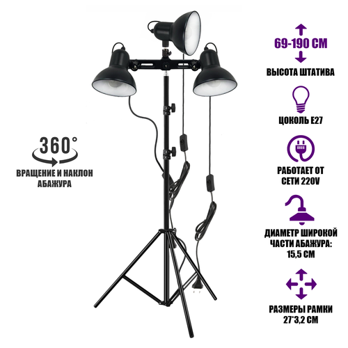 Напольный фитосветильник JBMB-3 с 3 средними черными абажурами с регулировкой угла наклона