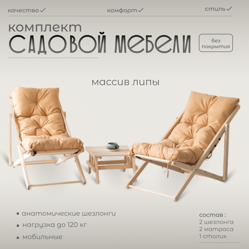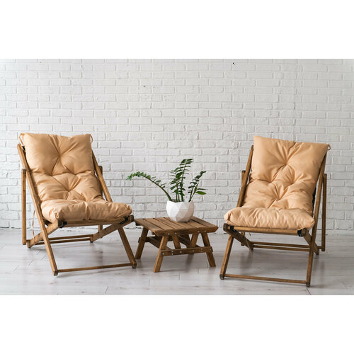 Комплект из двух деревянных кресел шезлонгов с бежевыми матрасами и столиком