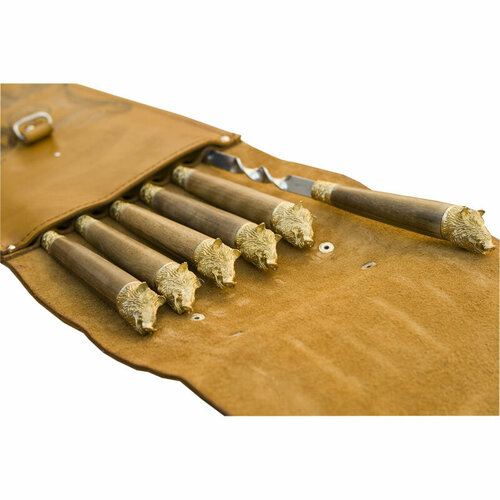 Чехол для шампуров из натуральной кожи 1 шт.2.Шампур из нержавеющей стали 2 мм уголком с рукоятью из ореха и латуни (общая длина шампура — 67 см: длина полотна — 54 см, длина рукояти — 13 см)6 шт.3.Чехол из спанбонда1 шт.
