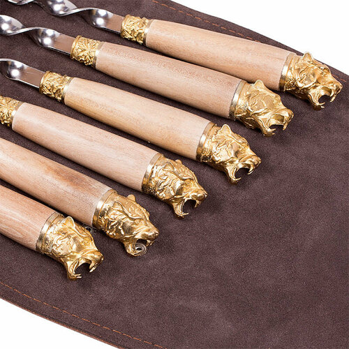 Шампур из нержавеющей стали 2 мм уголком с рукоятью из ореха и латуни в форме ружейного патрона (общая длина шампура — 67 см: длина рукояти — 9 см; длина полотна — 58 см)6шт.4.Чехол из спанбонда (нетканый мягкий материал)1шт.