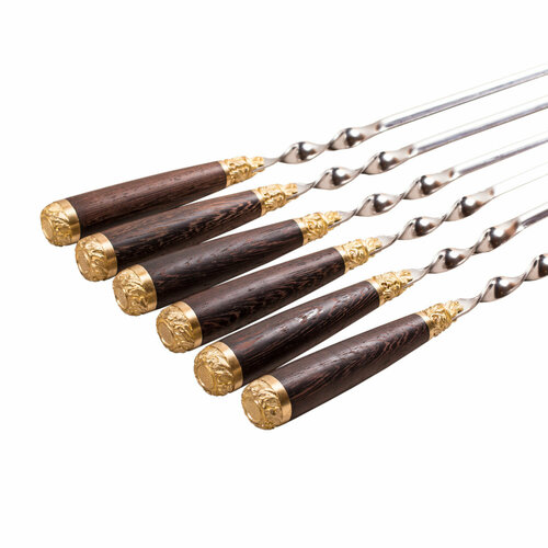 Колчан для шампуров из натуральной кожи темно-коричневого цвета с росписью ручной работы1шт.2.Шампур с рукоятью из ореха и латуни (общая длина шампура — 67 см: длина полотна — 54 см, длина рукояти — 13 см)6шт.3.Чехол из спанбонда (нетканый мягкий материал)1шт.