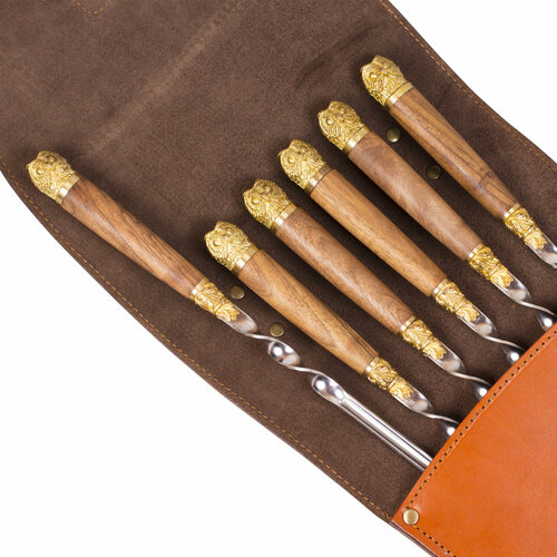 Колчан для шампуров из натуральной кожи с росписью ручной работы1шт.2.Шампур с рукоятью из ореха и латуни в виде головы орла (общая длина шампура — 69 см: длина полотна — 54 см, длина рукояти — 15 см)6шт.3.Чехол из спанбонда (нетканый мягкий материал)1шт.