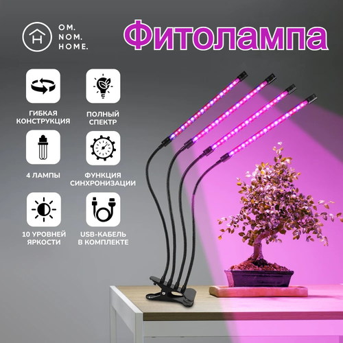 Фитолампа для растений, светодиодная, 4 лампы, полный спектр, на прищепке, USB