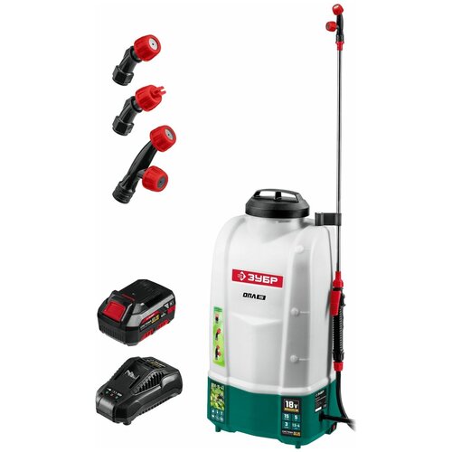 ЗУБР 18 В, Li-Ion, 15 л бак, 1 АКБ (4А/ч), опрыскиватель аккумуляторный ОПЛ-15-41 Мастер зеленый, белый, светлый, серый