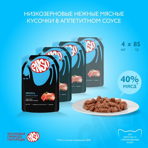 ENSO Корм влажный полнорационный для взрослых кошек, кусочки в соусе с лососем, пауч 85г 4 шт.