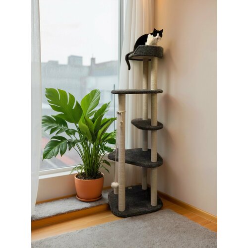 Игровой комплекс для кошек, Моя Котя, "Башня Святого Олафа", темно-серый ковролин и хлопковый канат Моя котя