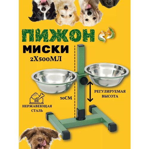 Подставка с мисками, 2 х 500 мл, высота 30 см, разборная, зелёная Пижон