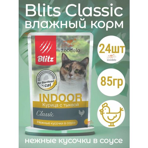 BLITZ Classic Indoor Курица с тыквой, кусочки в соусе, корм консервированный полнорационный для стерилизованных кошек и кастрированных котов, 85 гр (24 шт/уп) Blitz
