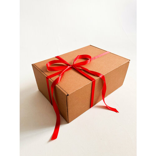 2 штуки - Подарочная коробка с наполнителем крафт и красной лентой (37x26x12 см)