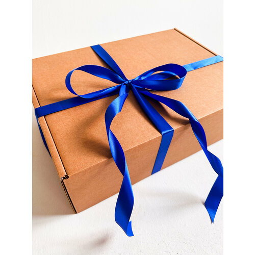 Большая подарочная коробка с наполнителем крафт и синей лентой (37x26x12 см)