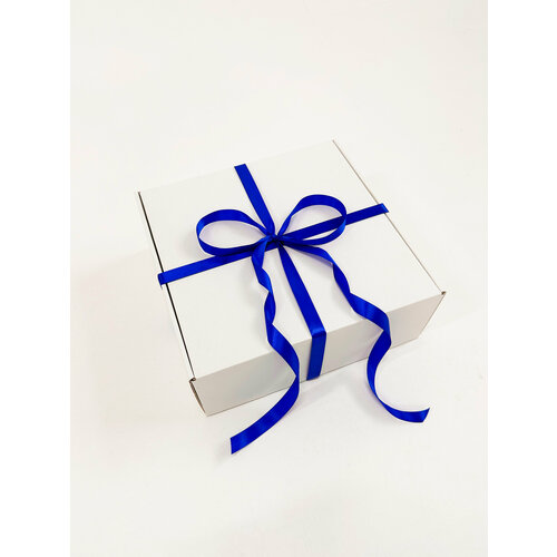 Белая подарочная коробка GILEV 32x32x12 см с наполнителем и синей лентой