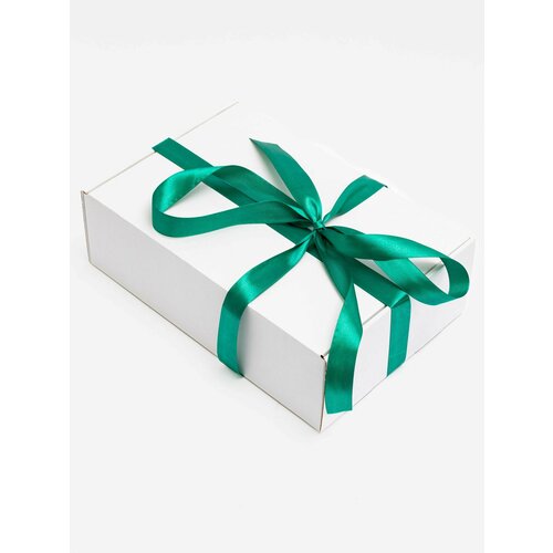Белая подарочная коробка 32х22х10см с зеленой лентой и наполнителем