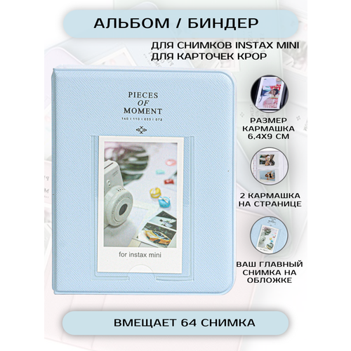голубой, серыйДанный фотоальбом станет прекрасным дополнением к вашему фотоаппарату моментальной печати, а огромный выбор цветов не оставит никого равнодушным. В альбоме 16 листов с кармашками для 64 фотографий. На одном листе с двух сторон помещается 4 фотографии. Размер снимков: 86x54 мм. Подходит для фотокарточек Instax mini 8/9/10/11, Mini 40 , mini 70, Hello kitty, Minion. Защити свои воспоминания в красивом альбоме!
