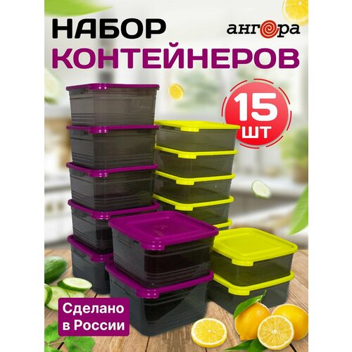 Набор пластиковых контейнеров для хранения и заморозки, Ангора, 0,7 и 1 литр, 15 штук, желтый / фуксия