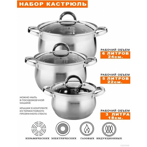 Набор кастрюль Hoffmann, нержавеющая сталь/закаленное стекло/ кастрюли 1,3 л. (14 см), 2,1 л. (16 см), 3,1 л. (18 см).
