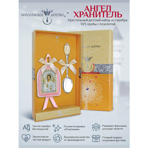 Набор детский: икона розового цвета Ангел Хранитель и серебряная ложка с буквой "Е" с позолотой в футляре
